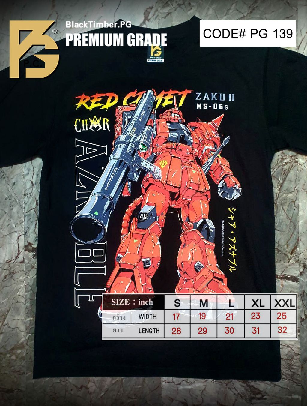 PG139 GUNDAM ZAKU II MS-06S CHAR AZNABLE ANIME MECH GUNPLA COLLECTION ORIGINAL PREMIUM GRADE BLACK TIMBER COTTON T-SHIRT